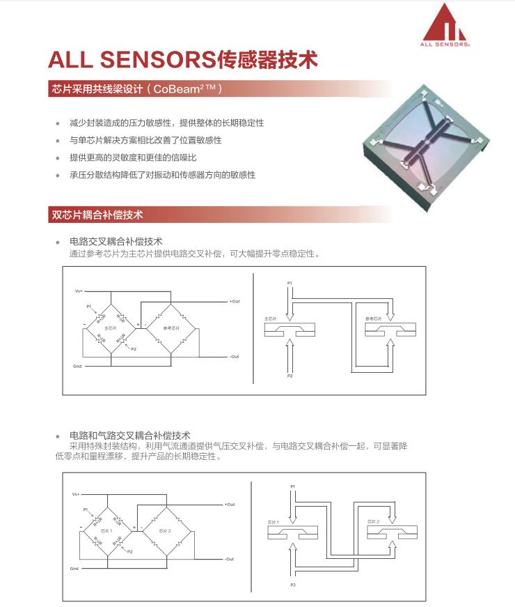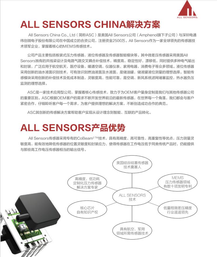 美國All Sensors (All Sensors Corporation.)是一家技術應用型公司,是全球極少數掌握著核心傳感技術的公司之一。公司創始人Dennis是美國硅谷傳奇人物,于70年代在硅谷發明了全球第一顆壓力傳感器。30年來ALLSensors一直致力于為OEM客戶設計定制非常多經典的傳感器,部分經典產品并被業界某大公司收購并發揚光大。 All Sensors掌握著世界領先的MEMS傳感器技術,如獨有的CoBeam2 TM傳感器技術等。